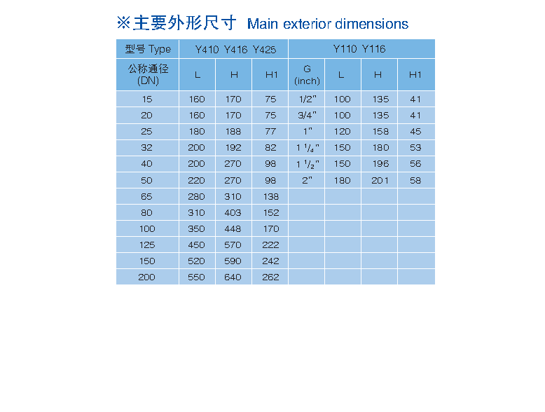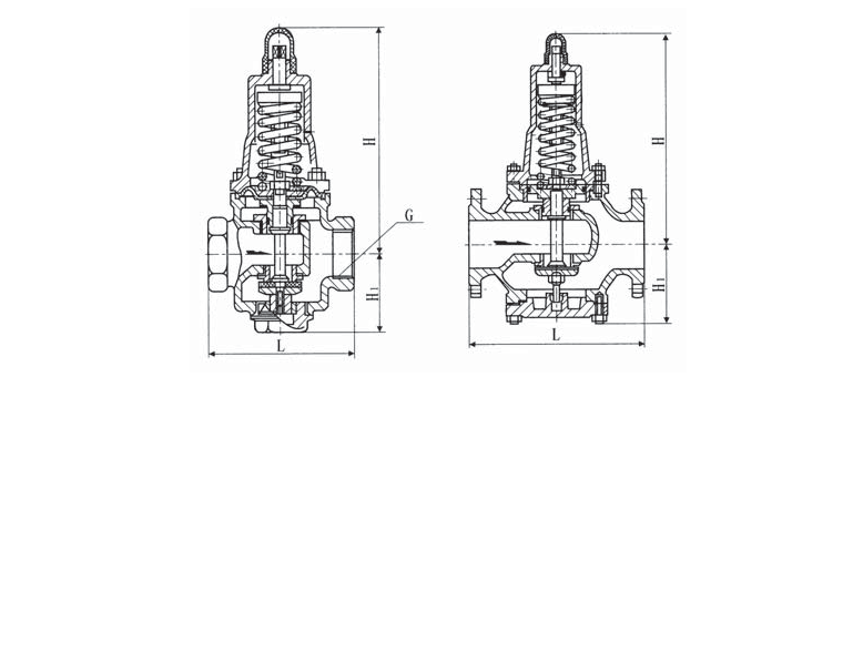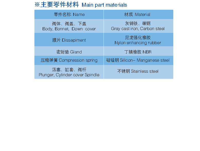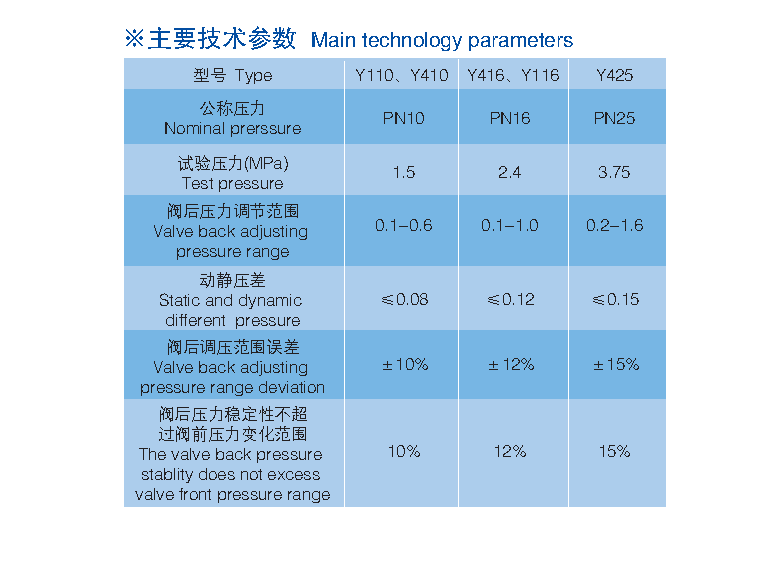 Y110、Y410、Y416,  Y425型減壓穩(wěn)壓閥由閥體、閥蓋、壓縮彈簧、閥桿、活塞(膜片)、缸套、閥座及密封墊等零件組成。